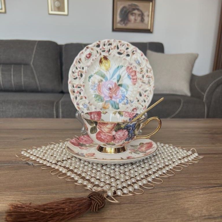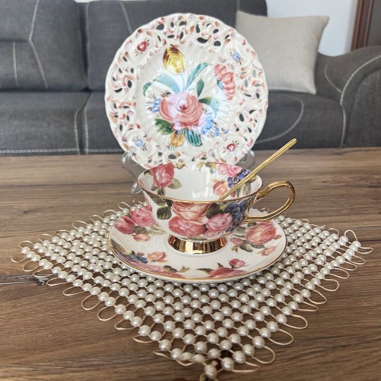 Рози и перли - антикварен комплект от чаша и чиния, костен порцелан, италианска докоративна чиния и покривка от перли