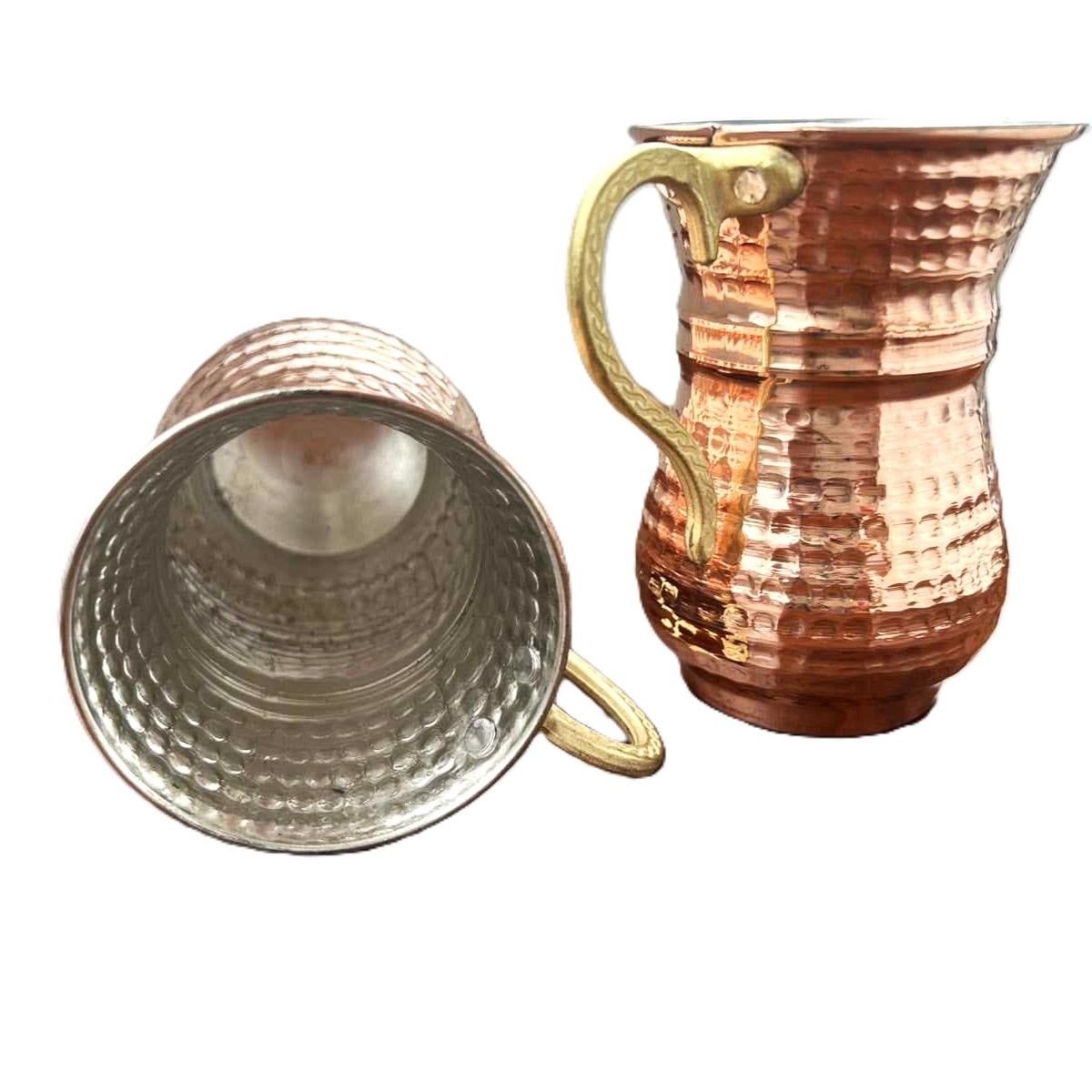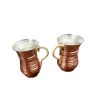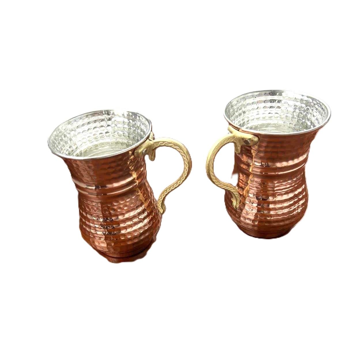 Комплектът от две чаши е изкован от мед, допълнително калайдисан от вътрешната страна, за да бъде годен за употреба. Към чашите е здраво закрепена с два нита красива метална дръжка с изящна форма. Дръжките допълват естестическия вид на чашите, като придават зъвършеност и съвършенство! Но дръжките имат и практическа функция. Когато пълните чашите с айрян с лед, с топъл чай или кафе - ръцете Ви няма да замръзнат или да се изгорите!