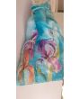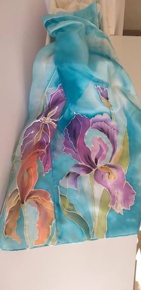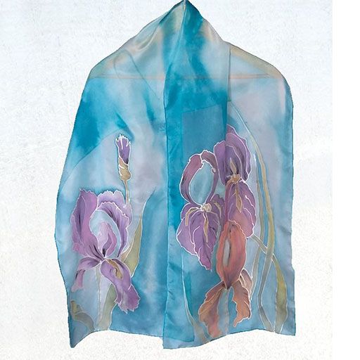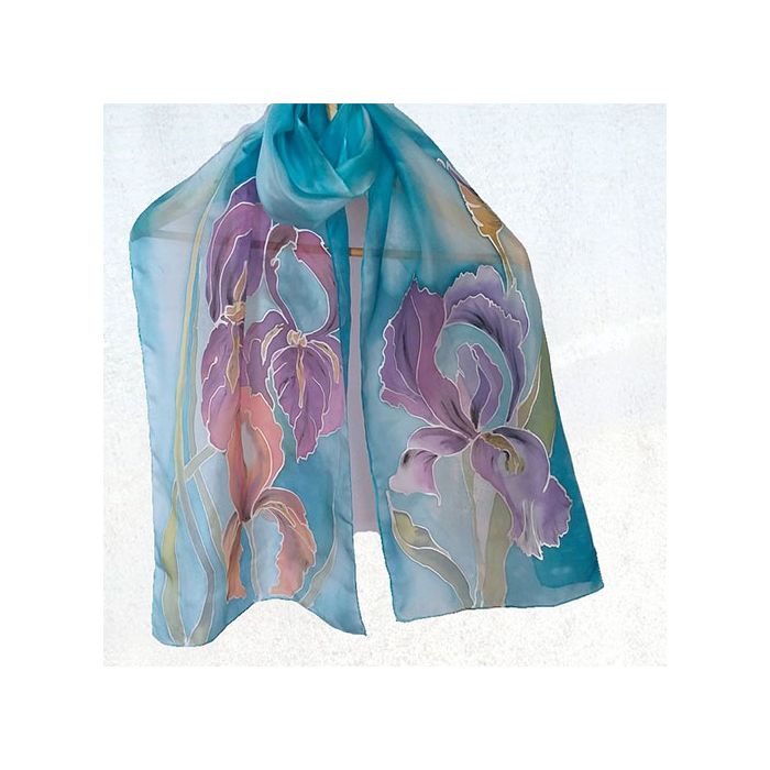 Ръчно рисуван шал, Ириси на фон тюркоаз, от 100 % естествена коприна.