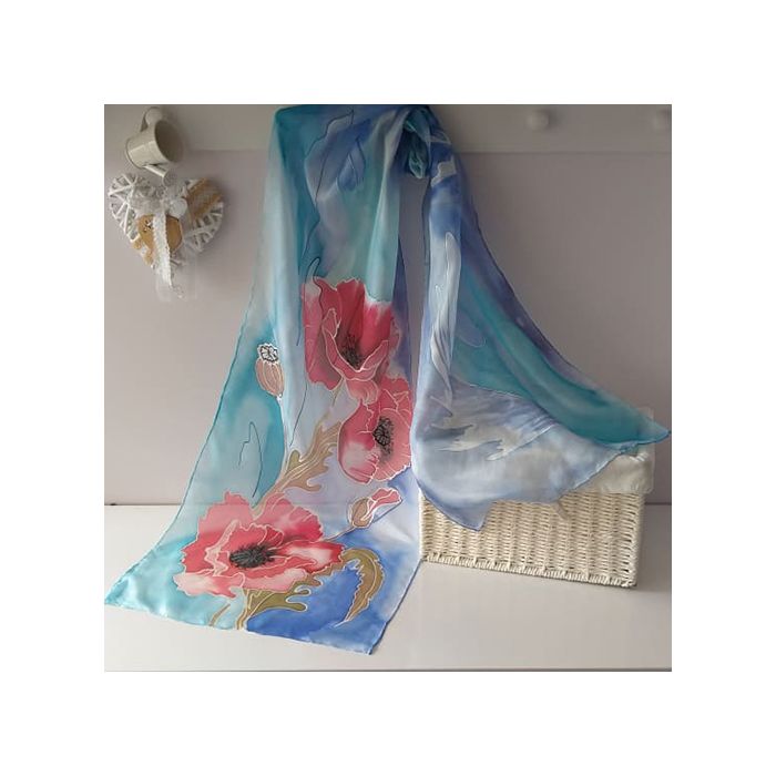 Шал Макове на син фон, ръчно рисуван шал от 100% естествена коприна