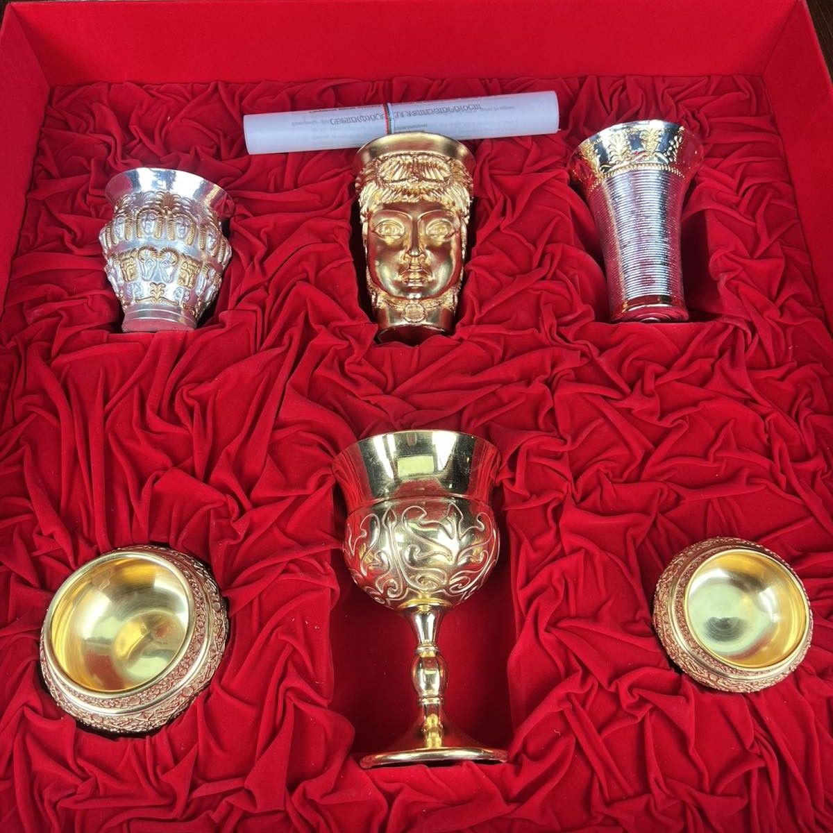 - Чашата на боговете – ръчна изработка по метода на галванопластиката от сребро проба 999,9 и злато 24 карата – тегло около 140 гр.