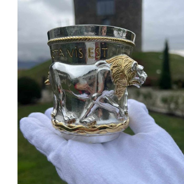 Сребърен бокал на силата, авторски модел, изработен от сребро проба 999,9 и злато 24 карата с изображения на лъв и бик в двубой.
