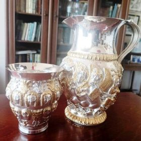 Сребърен комплект бокали на боговете, който се състои от чаша на боговете, античен сребърен бокал за вино и чаша от най-висока проба сребро с тракийски ловни сцени