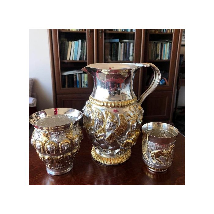 Сребърен комплект за вино на боговете, състоящ се от сребърна кана, реплика на кана от Рогозенското съкровище , скифос - сребърна чаша на боговете и сребърна чаша за бренди с тракийски сцени, реплики на тракийско съкровище.