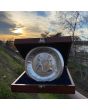 Кутията е с размери 25 см х 25 см х 6 см. Кутията е тапицирана с червено или синьо кадифе, по желание на клиента.