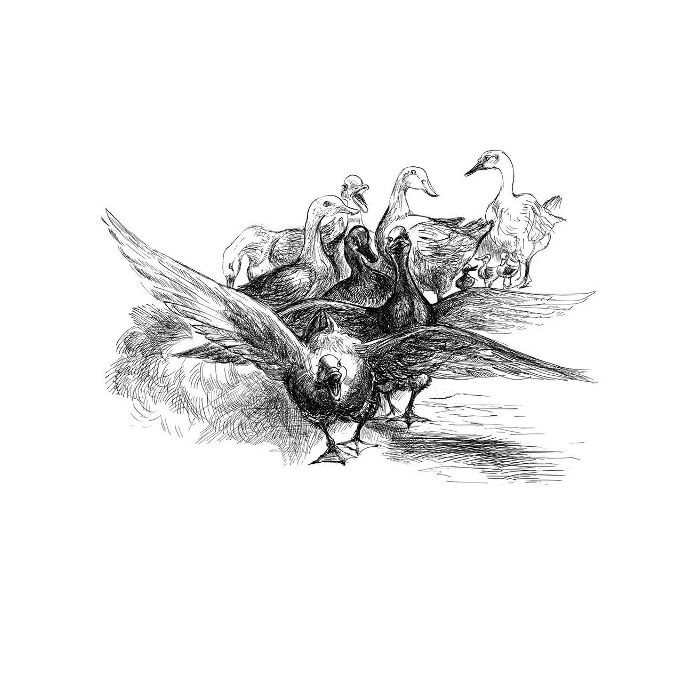 Майсторска графика, оригинал, изпълнена с много финес, усет към детайла и с чувство за хумор! Спомняте ли си чудесната детска приказка за златната гъска....Само че семейството на кръчмаря тук е оприличено на стадо гъски....И при гъските трябв да има лидер. И кой да е той, ако не златната гъска!